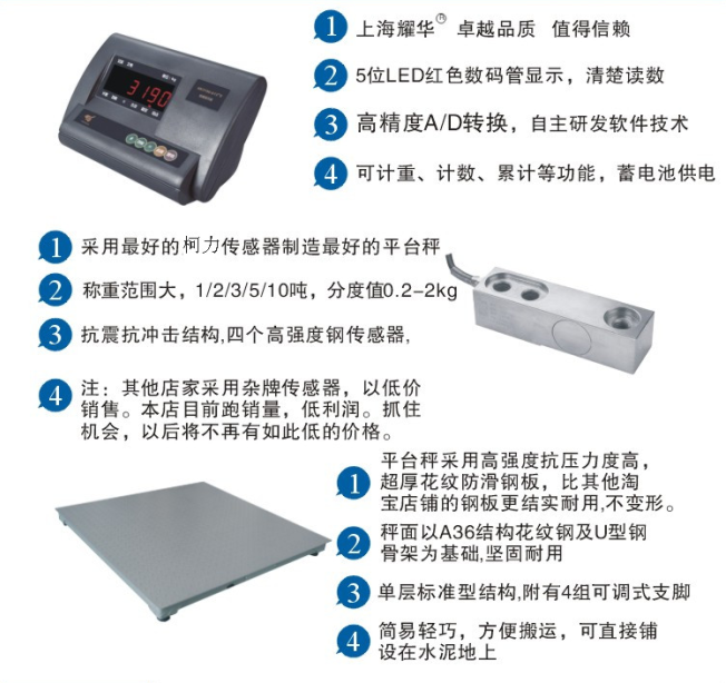 電子式地上衡由稱重傳感器、承重臺(tái)和稱重顯示器組成。可以放置在堅(jiān)實(shí)地面上進(jìn)行稱量,也可安放在淺基坑上或在其兩側(cè)加裝帶有一定坡度的引道,供手推車稱重使用.